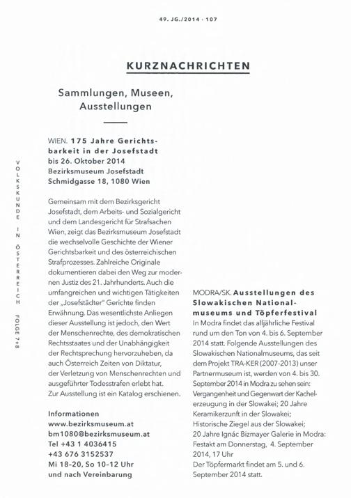 MODRA/ SK. Ausstellungen desSlowakischen National-museums und TöpferfestivalIn Modra findet das alljährliche Festivalrund um den Ton von 4. bis 6. September2014 statt. Folgende Ausstellungen desSlowakischen Nationalmuseums, das seitdem Projekt TRA- KER( 2007-2013) unserPartnermuseum ist, werden von 4. bis 30.September 2014 in Modra zu sehen sein:Vergangenheit und Gegenwart der Kachel-erzeugung in der Slowakei; 20 JahreKeramikerzunft in der Slowakei;Historische Ziegel aus der Slowakei;20 Jahre Ignác Bizmayer Galerie in Modra:Festakt am Donnerstag, 4. September2014, 17 Uhr