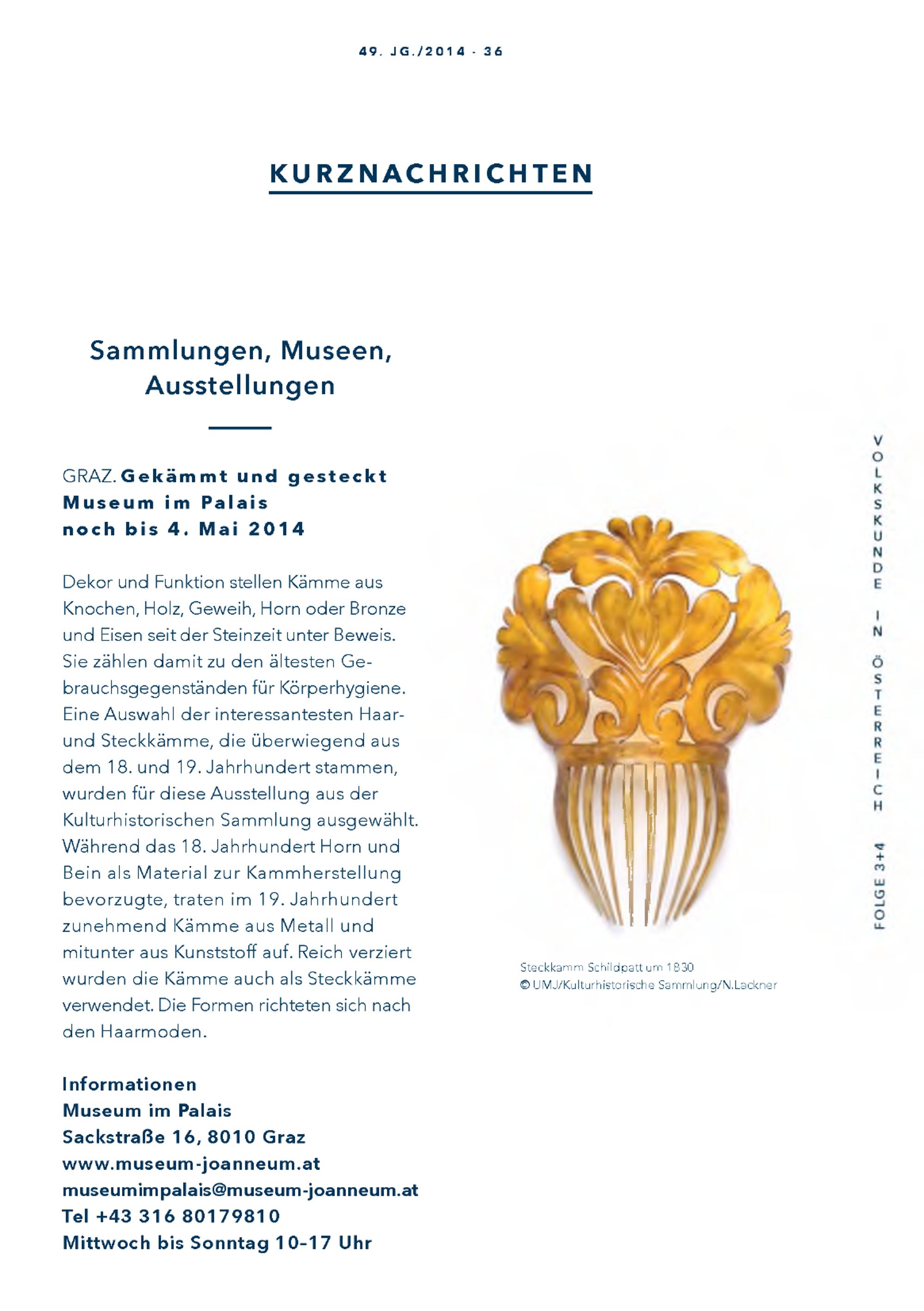 Dekor und Funktion stellen Kämme ausKnochen, Holz, Geweih, Horn oder Bronzeund Eisen seit der Steinzeit unter Beweis.Sie zählen damit zu den ältesten Ge-brauchsgegenständen für Körperhygiene.Eine Auswahl der interessantesten Haar-und Steckkämme, die überwiegend ausdem 18. und 19. Jahrhundert stammen,wurden für diese Ausstellung aus derKulturhistorischen Sammlung ausgewählt.Während das 18. Jahrhundert Horn undBein als Material zur Kammherstellungbevorzugte, traten im 19. Jahrhundertzunehmend Kämme aus Metall undmitunter aus Kunststoff auf. Reich verziertwurden die Kämme auch als Steckkämmeverwendet. Die Formen richteten sich nachden Haarmoden.