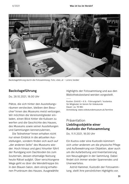 Plätze, die sich hinter den Ausstellungs-räumen verstecken, bleiben den Besu-cher* innen des Museums meist verborgen.Wir möchten die Vereinsmitglieder ein-laden, einen Blick hinter die Kulissen zuwerfen und die Geschichte des Hauses,des Museums sowie seiner Ausstellungenund Sammlungen kennenzulernen.