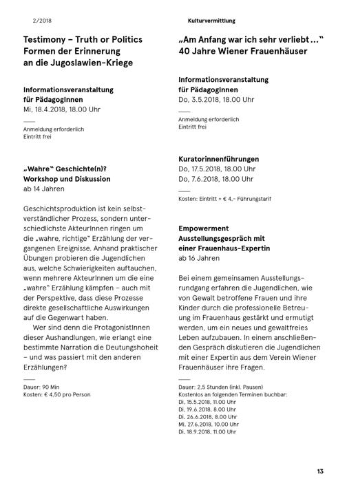 Bei einem gemeinsamen Ausstellungs-rundgang erfahren die Jugendlichen, wievon Gewalt betroffene Frauen und ihreKinder durch die professionelle Betreu-ung im Frauenhaus gestärkt und ermutigtwerden, um ein neues und gewaltfreiesLeben aufzubauen. In einem anschließen-den Gespräch diskutieren die Jugendlichenmit einer Expertin aus dem Verein WienerFrauenhäuser ihre Fragen.