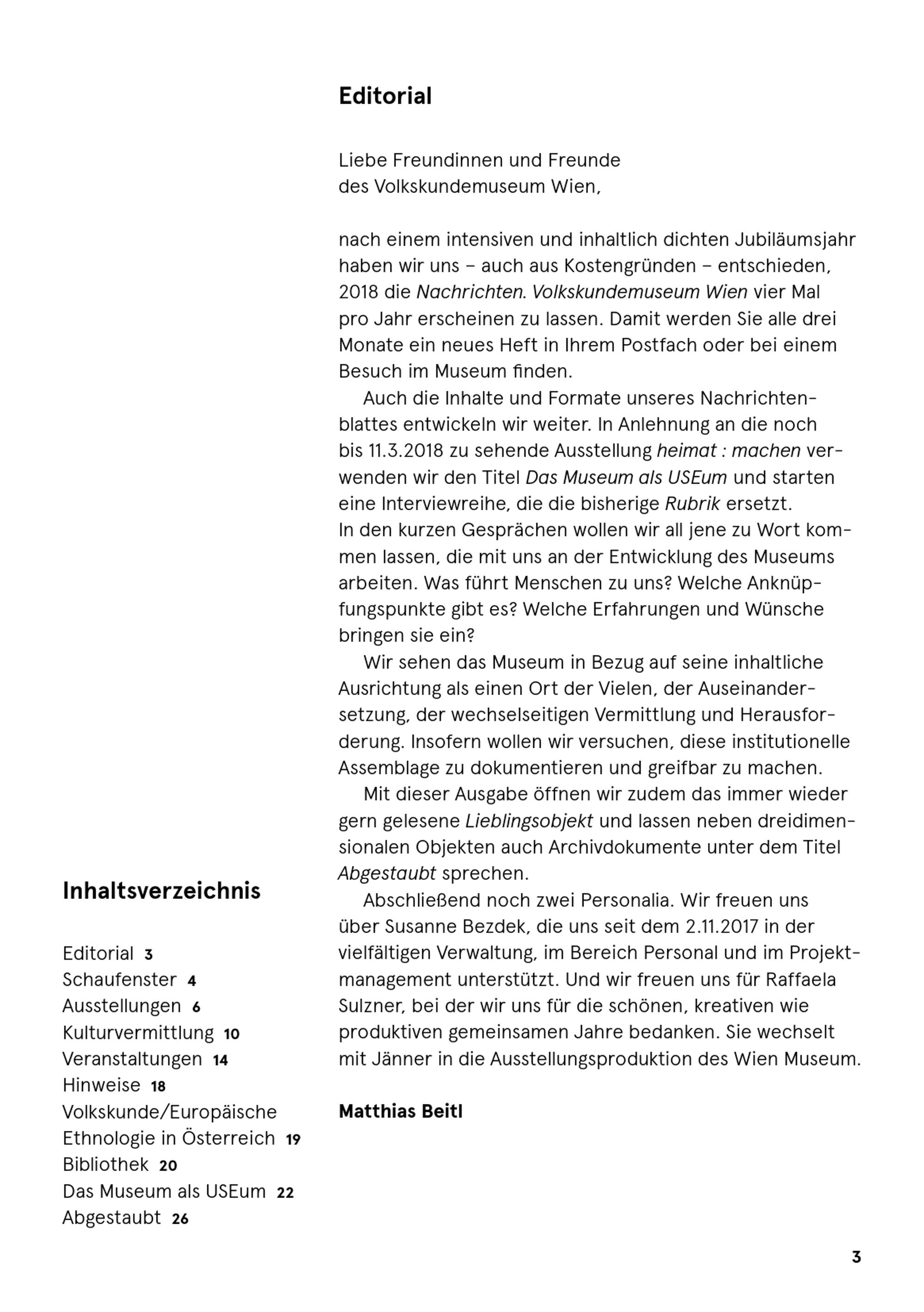 Auch die Inhalte und Formate unseres Nachrichten-blattes entwickeln wir weiter. In Anlehnung an die nochbis 11.3.2018 zu sehende Ausstellung heimat: machen ver-wenden wir den Titel Das Museum als USEum und starteneine Interviewreihe, die die bisherige Rubrik ersetzt.In den kurzen Gesprächen wollen wir all jene zu Wort kom-men lassen, die mit uns an der Entwicklung des Museumsarbeiten. Was führt Menschen zu uns? Welche Anknüp-fungspunkte gibt es? Welche Erfahrungen und Wünschebringen sie ein?