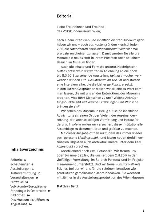 nach einem intensiven und inhaltlich dichten Jubiläumsjahrhaben wir uns auch aus Kostengründen- entschieden,2018 die Nachrichten. Volkskundemuseum Wien vier Malpro Jahr erscheinen zu lassen. Damit werden Sie alle dreiMonate ein neues Heft in Ihrem Postfach oder bei einemBesuch im Museum finden.