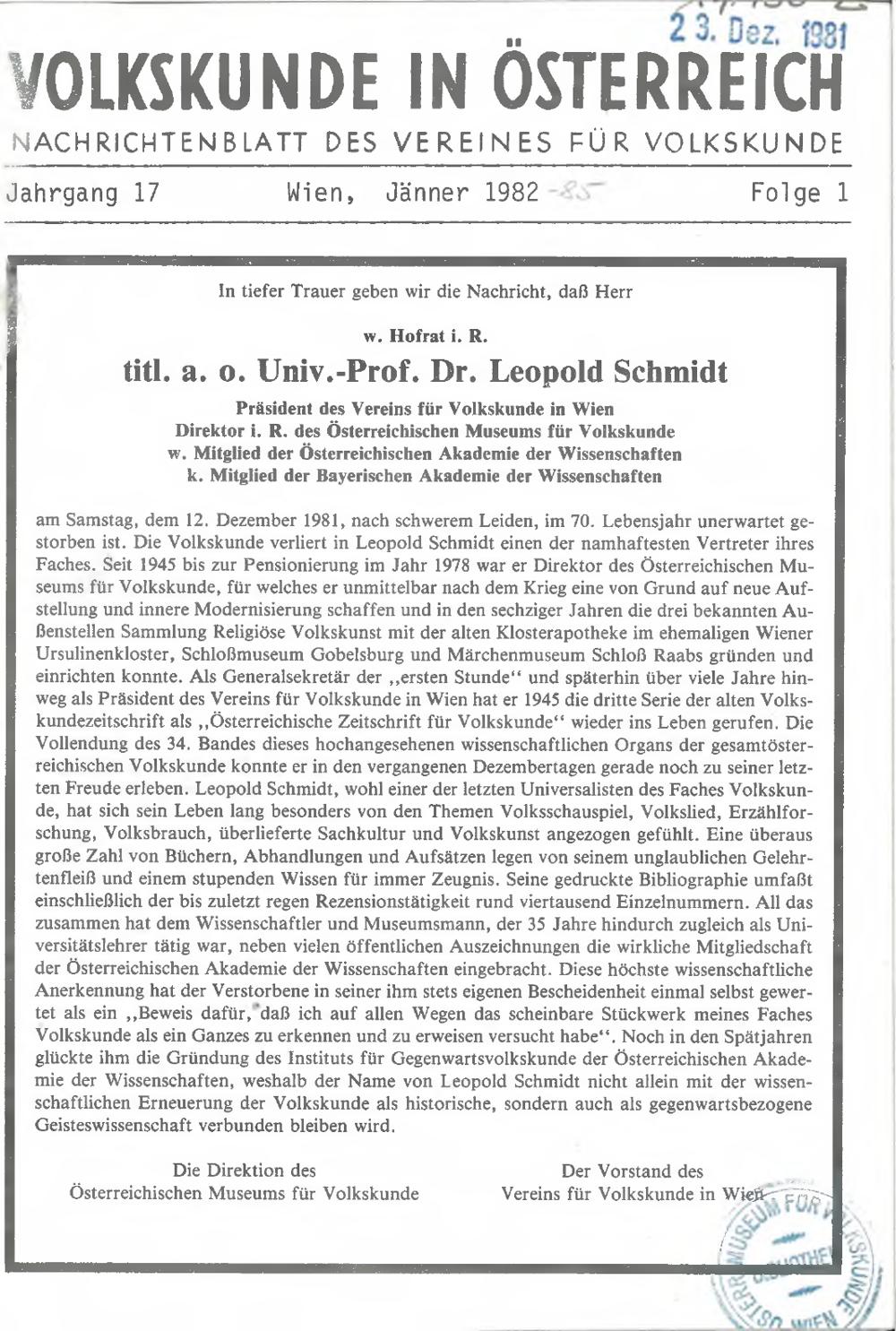 17 (1982) / Volkskunde in Österreich VIÖ