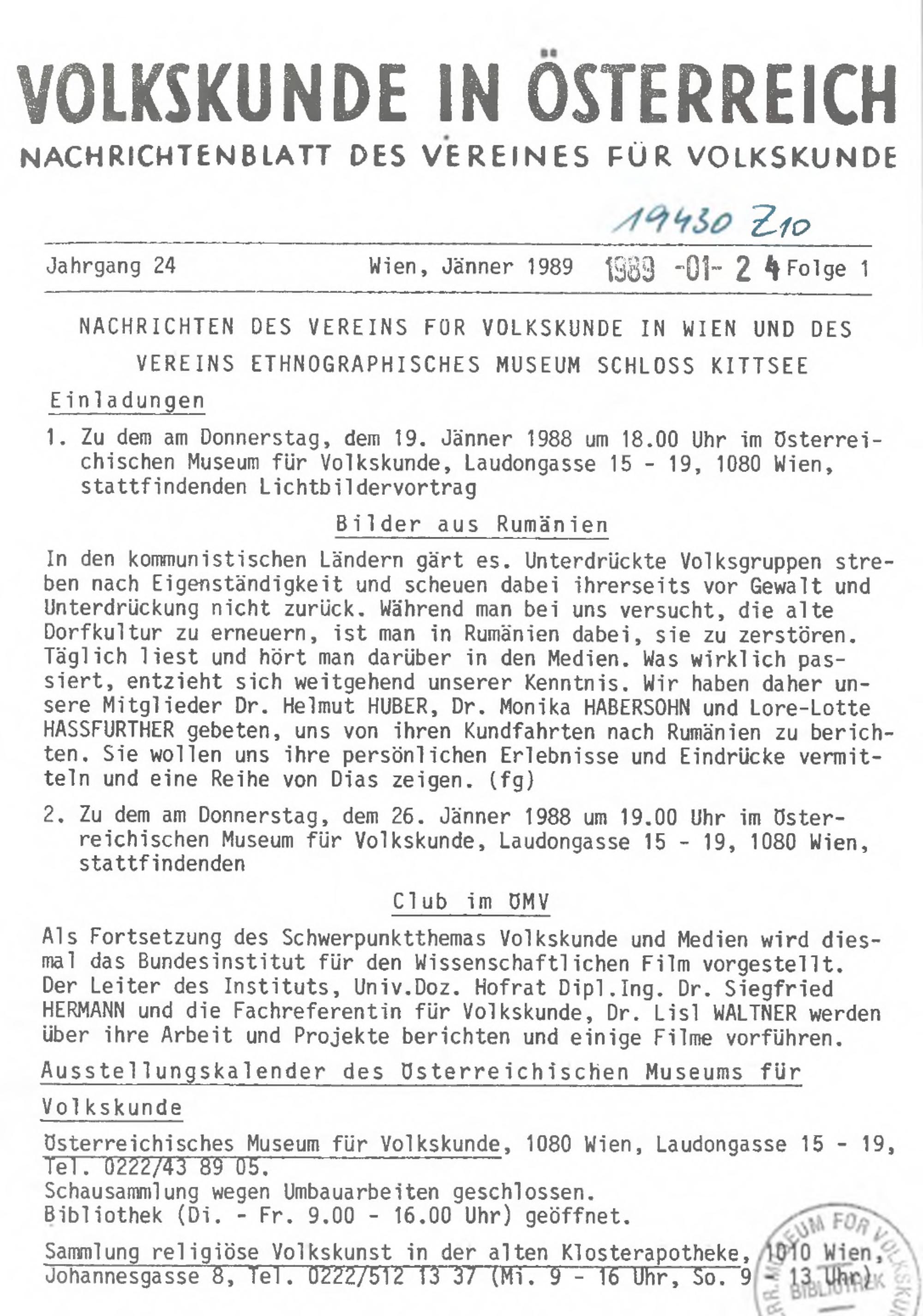 Nachrichten. Volkskundemuseum Wien