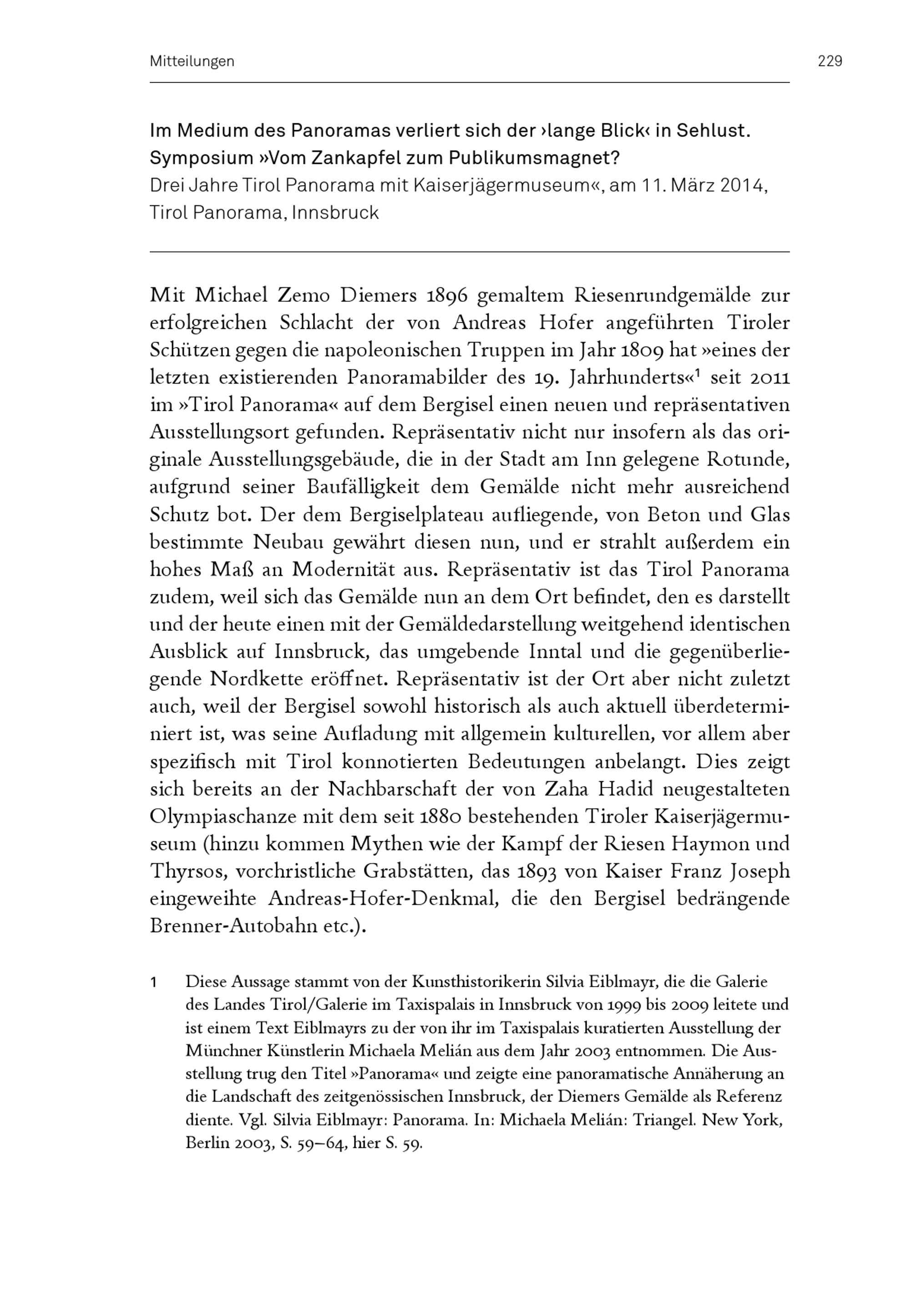 Im Medium des Panoramas verliert sich der ›lange Blick‹ in Sehlust : Symposium »Vom Zankapfel zum Publikumsmagnet? Drei Jahre Tirol Panorama mit Kaiserjägermuseum«, am 11. März 2014, Tirol Panorama, Innsbruck