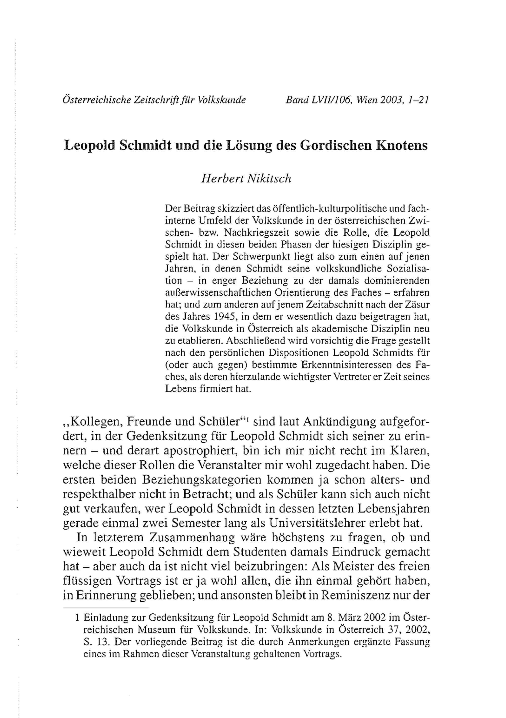 Nikitsch, Herbert: Leopold Schmidt und die Lösung des Gordischen Knotens