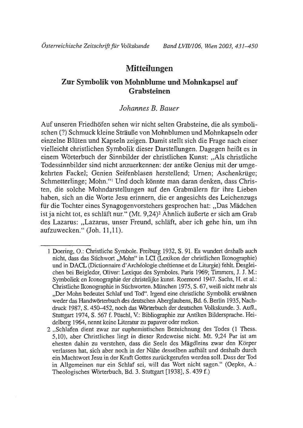 Bauer, Johannes B.: Zur Symbolik von Mohnblume und Mohnkapsel auf Grabsteinen