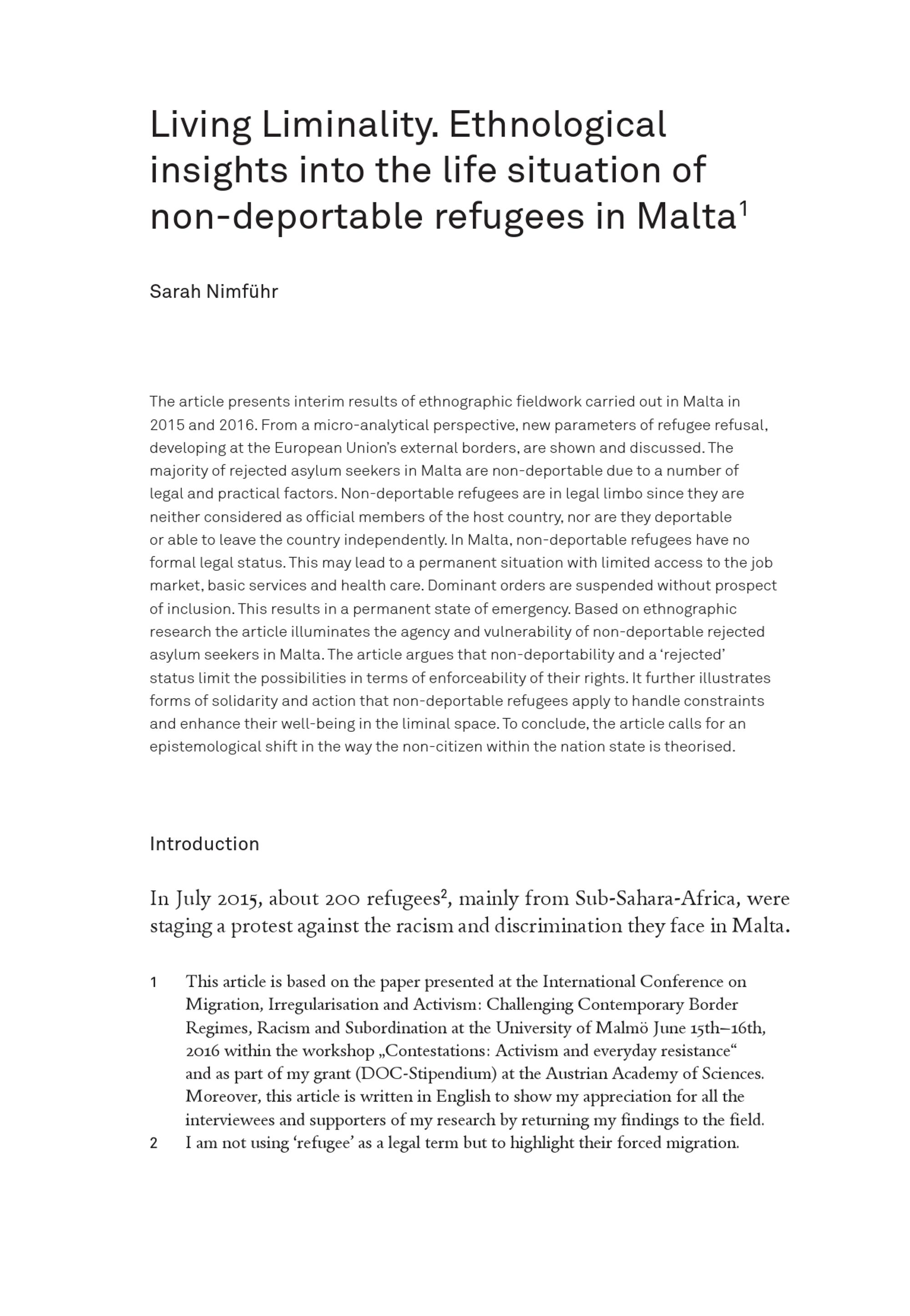 Nimführ, Sarah: Living Liminality. Ethnological insights into the life situation of non-deportable refugees in Malta