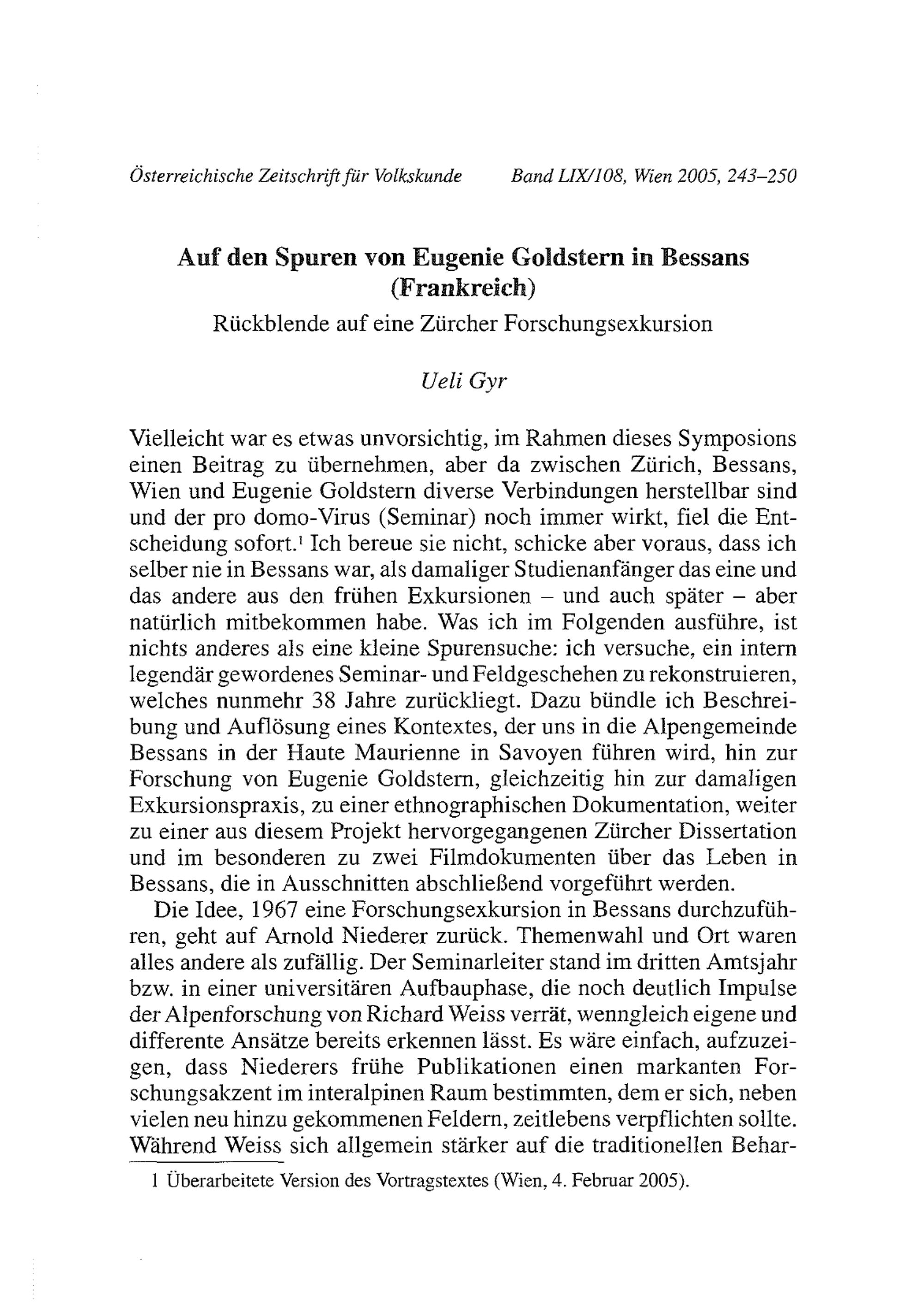 Auf den Spuren von Eugenie Goldstern in Bessans (Frankreich) : Rückblende auf eine Zürcher Forschungsexkursion