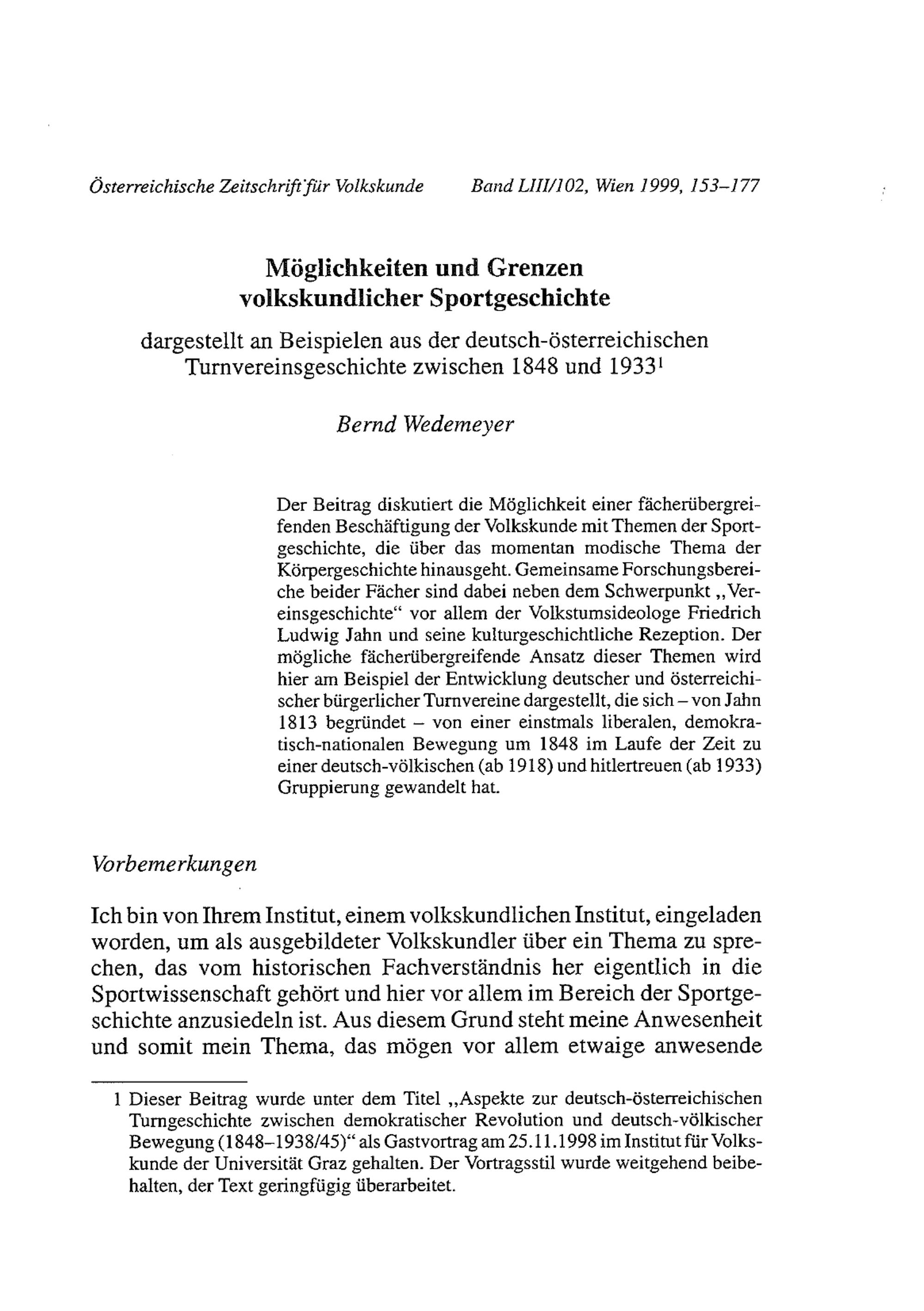 Möglichkeiten und Grenzen volkskundlicher Sportgeschichte : dargestellt an Beispielen aus der deutsch-österreichischen Turnvereinsgeschichte zwischen 1848 und 1933