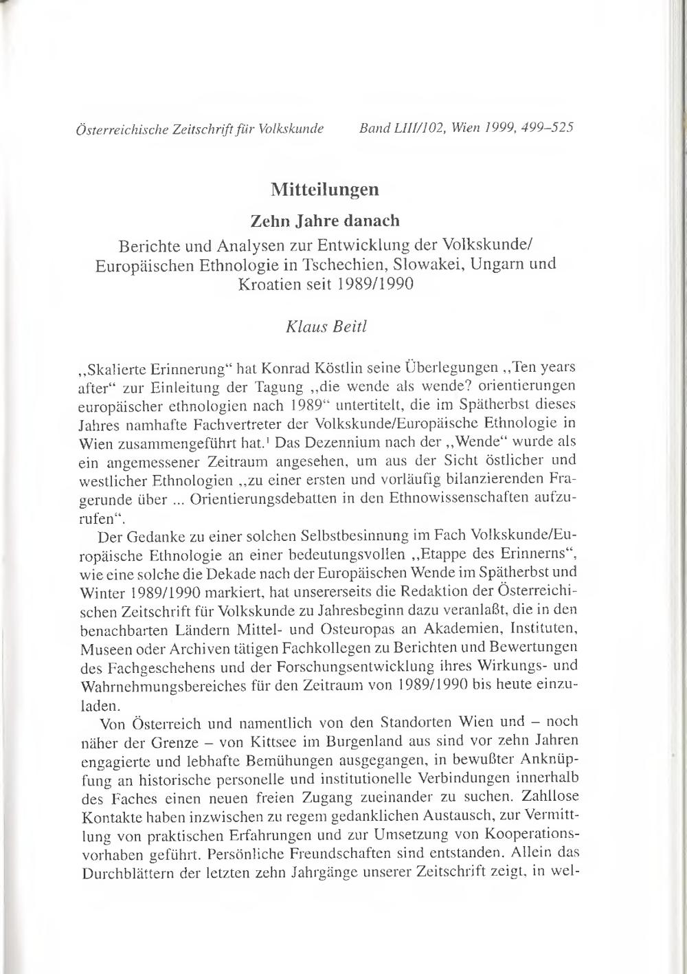 Zehn Jahre danach : Berichte und Analysen zur Entwicklung der Volkskunde/Europäischen Ethnologie in Tschechien, Slowakei, Ungarn und Kroatien seit 1989/1990